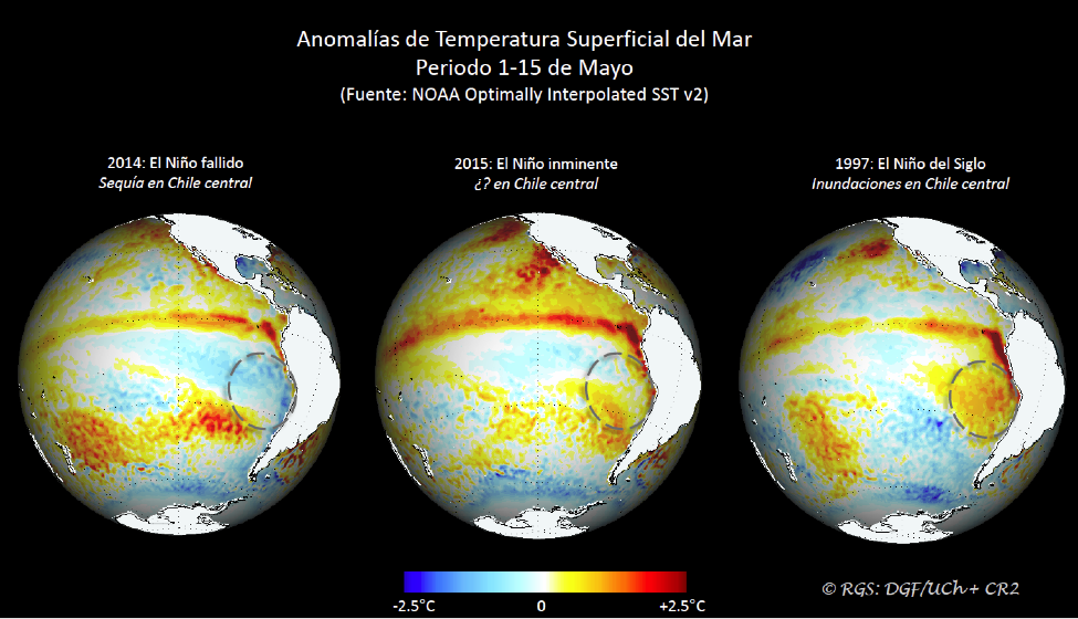 El panel central de la figura 1 muestra las anomalías de la TSM para las dos primeras semanas de Mayo del presente año. Al igual que el 2014 y 1997, existen anomalías cálidas a lo largo del Pacifico ecuatorial, hasta 2°C cerca de Sud América. También predominan en la actualidad anomalías cálidas en el Pacifico sur-oriental haciendo el otoño del 2015 mas similar al del año 1997 (lluvioso) que al 2014 (seco). Se configura así una condición de El Niño más robusta que el año pasado. Un análisis mucho más detallado del El Niño en curso puede encontrarse en el sitio web de la NOAA.