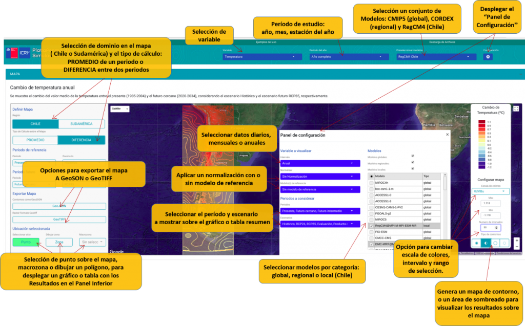 Las simulaciones mencionadas corresponden a datos grillados para diferentes dominios geográficos. Estos han sido generados con modelos globales o regionales o técnicas estadísticas o, en algunos casos, combinados con observaciones. Las simulaciones contemplan datos globales y regionales de escenarios históricos y futuros, obtenidos principalmente desde plataformas informáticas en línea de instituciones internacionales y nacionales desde 1997 a la fecha. Los datos observacionales consideran un producto grillado desarrollado por investigadores del Centro de Ciencia del Clima y la Resiliencia basado en datos de estaciones observacionales de la Dirección Meteorológica de Chile y de la Dirección General de Aguas, campos de reanálisis1 y datos satelitales. La compilación y organización de formatos de bases de datos grillados se realiza en la plataforma de almacenamiento del (CR)2 y es accesible en forma abierta (http://simulaciones.cr2.cl/). Cabe destacar que las variables climáticas a visualizar en esta plataforma fueron definidas en conjunto con la mesa de incumbentes reunida para este proyecto. La plataforma de visualización genera mapas, tablas, gráficos y series de tiempo para el dominio de Sudamérica, Chile y macrozonas de Chile predefinidas, así como para polígonos o puntos definidos en forma dinámica.