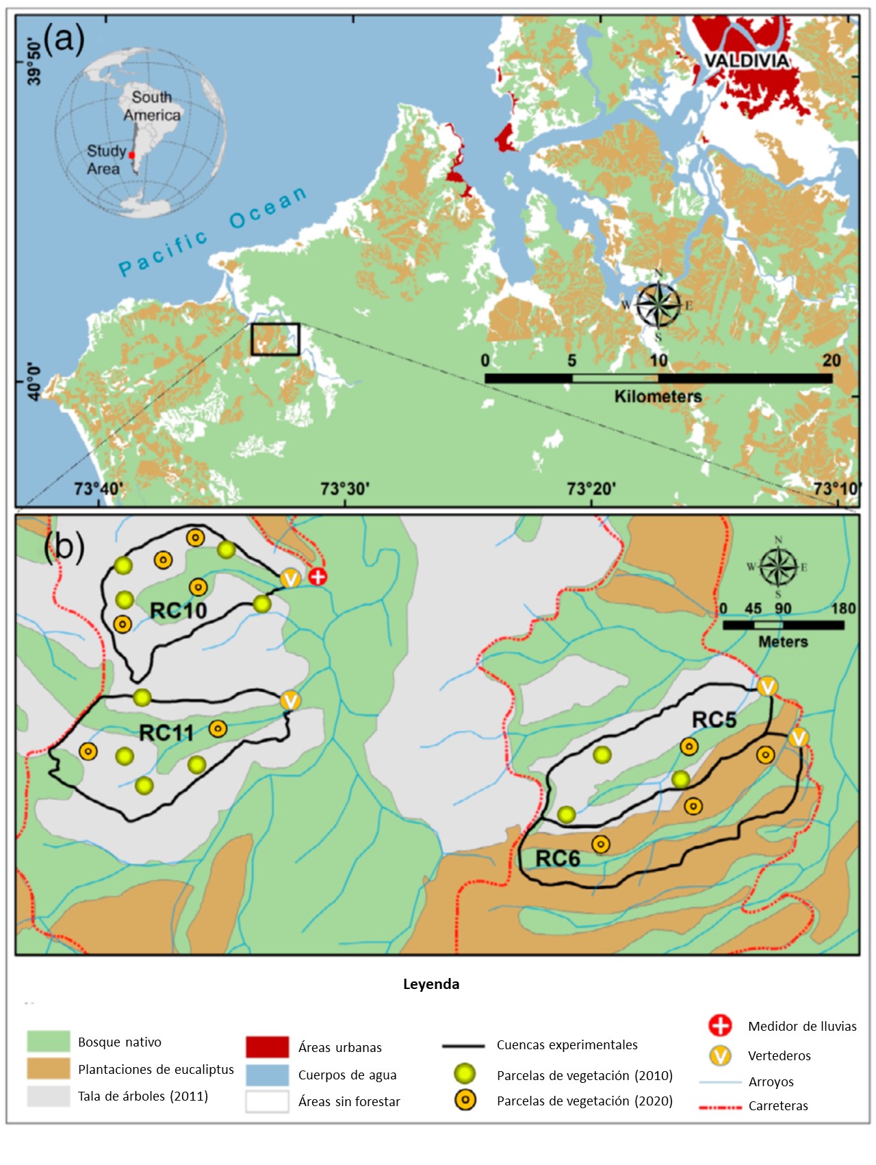 Figura 1. Sitio de estudio. El panel (a) muestra la ubicación de la Reserva Costera Valdiviana, en la costa de la zona centro-sur de Chile, al suroeste de la ciudad de Valdivia. En el panel (b) se muestran las cuatro cuencas estudiadas, denominadas RC5, RC6, RC10 y RC11. Fuente: Modificado de Lara et al (2021).