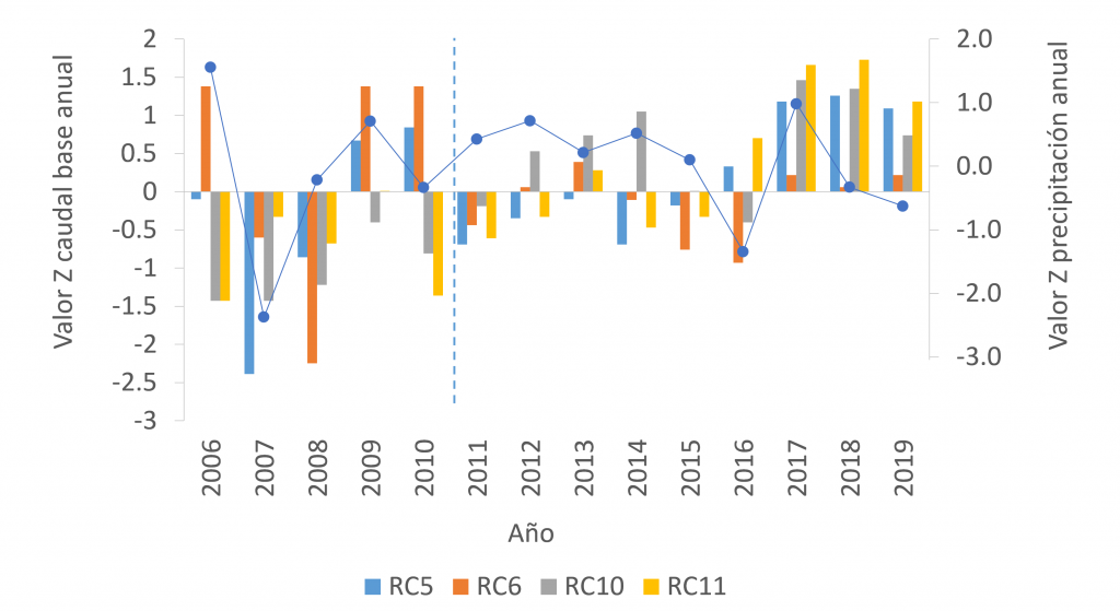 Figura 3. Variación de los caudales base anuales (barras) y la precipitación (línea), ambos expresados como desvíos estandarizados. La línea vertical segmentada muestra la tala rasa de la plantación de eucaliptos y comienzo de la restauración en 2011. Se aprecia que el caudal base comenzó a aumentar desde el año 2017 en adelante, lo que significaría que comenzó a recuperarse el contenido de agua en el suelo. Fuente: Modificado de Lara et al (2021).