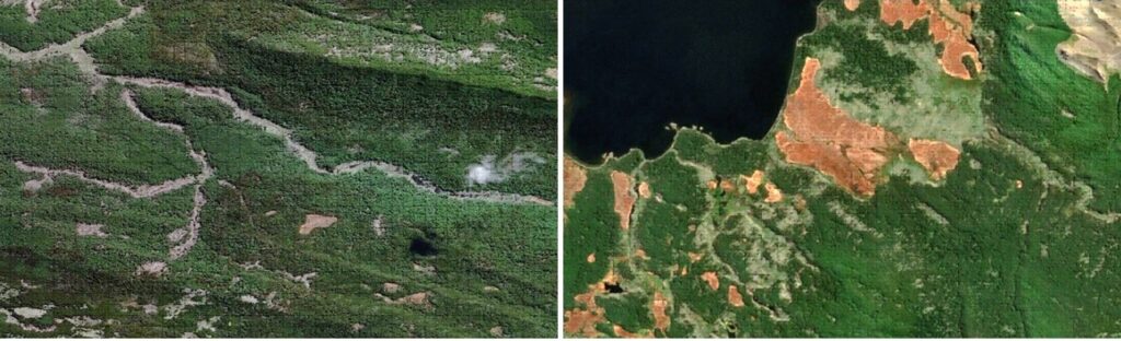 Imágenes satelitales del año 2020 (Google Earth) que muestran el impacto de los castores junto a importantes cursos de agua. El área anaranjada de la segunda imagen son turberas.