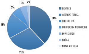 En cuanto a si está instalada en Chile una visión socio-política del cambio climático, podríamos aventurarnos a afirmar que existe más bien una agenda pública despolitizada que invisibiliza las relaciones conflictivas que se tejen alrededor del cambio climático, esto a la luz del análisis de las noticias en las que sólo un número y un perfil determinados de actores están presentes (Figura 4). En este sentido nos referimos a los científicos, que, en general, son los responsables de entregar evidencia y proyecciones a los medios de prensa de circulación nacional. Por otro lado, el sector privado y la sociedad civil tienen muy poca presencia, lo cual dificulta contar con una mirada de la sociedad acerca del cambio climático, al menos en lo referido al análisis de prensa aquí propuesto.