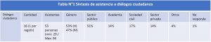 Desde fines de noviembre de 2018 hasta enero de 2019, el Ministerio del Medio Ambiente (MMA) llevó a cabo un proceso de diálogo y participación ciudadana temprana para la construcción del anteproyecto de Ley Marco de Cambio Climático. Este proceso contempló dos tipos de diálogos: los diálogos ciudadanos regionales, que cubrieron las 16 regiones del país[1], logrando un promedio cercano a las 50 personas por encuentro y con un porcentaje equilibrado desde la perspectiva de género, aunque con una importante sobrerrepresentación del sector público (ver Tabla N°1); y los diálogos ciudadanos sectoriales (dos en total), que fueron realizados en Santiago y que convocaron a expertos provenientes de la sociedad civil, academia, sector público y privado. Si bien no hay registros oficiales disponibles sobre el número de participantes de estos últimos, se identificó que en cada diálogo participó un total aproximado de 100 personas.