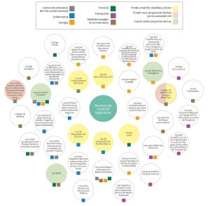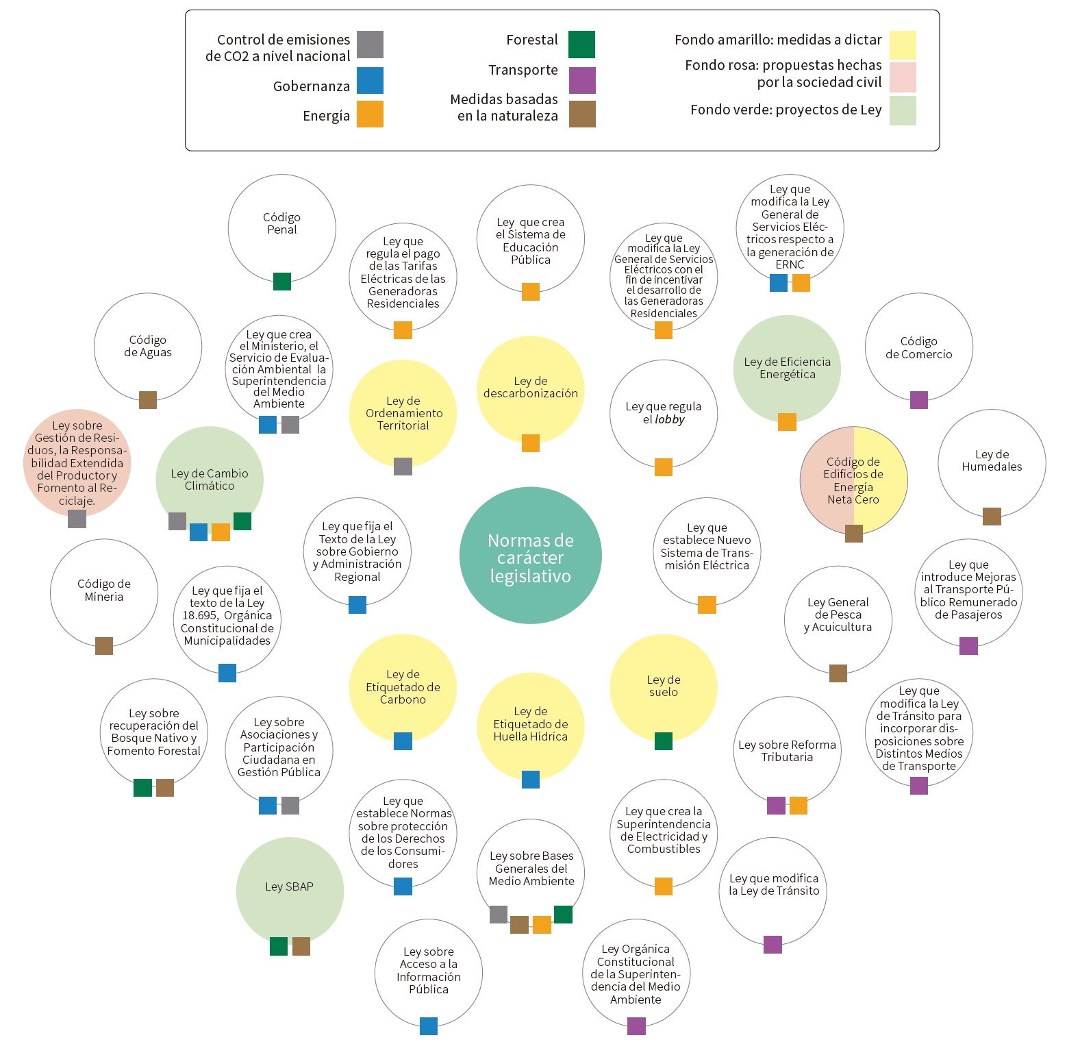 Figura 2: Normas de carácter legislativo. En color amarillo dejamos aquellas normas que se deberían dictar, los círculos rodados representan las propuestas de la sociedad civil, y en color verde claro los proyectos de ley que están en trámite. Cada uno de estos cuerpos legales señala a qué sector impactaría (cuadrados). (Click sobre la imagen para verla en mayor tamaño)