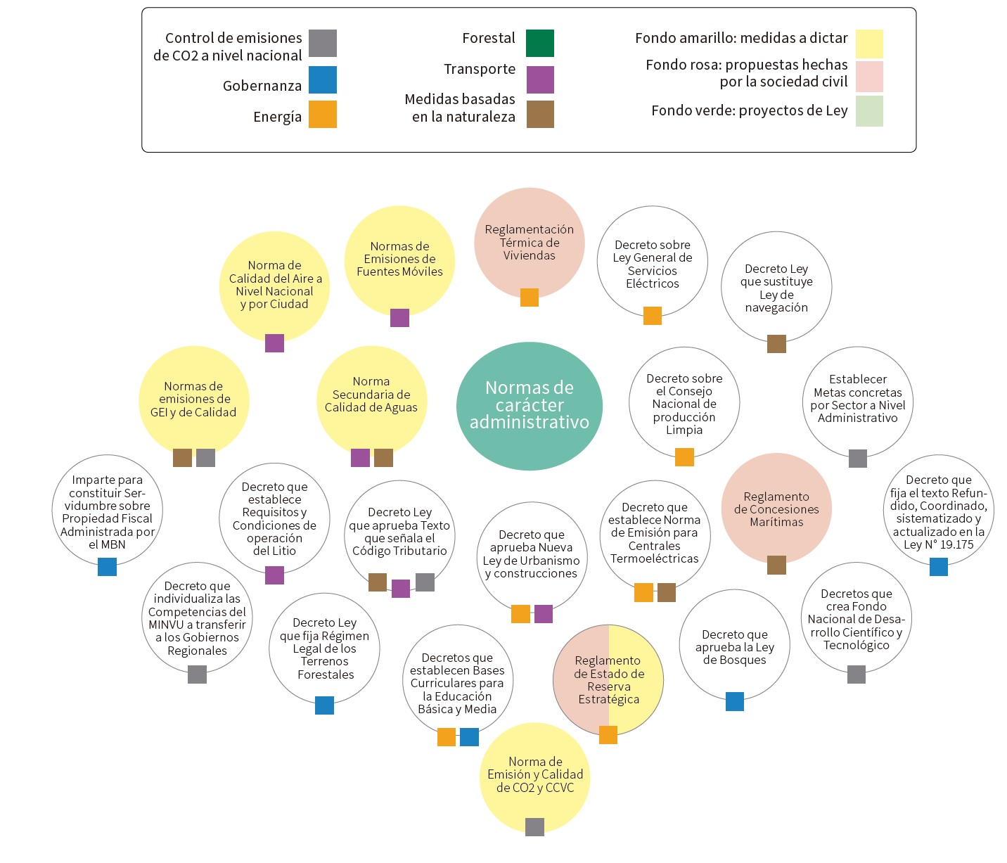 Figura 3: Normas de carácter administrativo. En color amarillo dejamos aquellas normas que se deberían dictar, los círculos rodados representan las propuestas de la sociedad civil, y en color verde claro los proyectos de ley que están en trámite. Cada uno de estos cuerpos legales señala a qué sector impactaría (cuadrados). (Click sobre la imagen para verla en mayor tamaño)