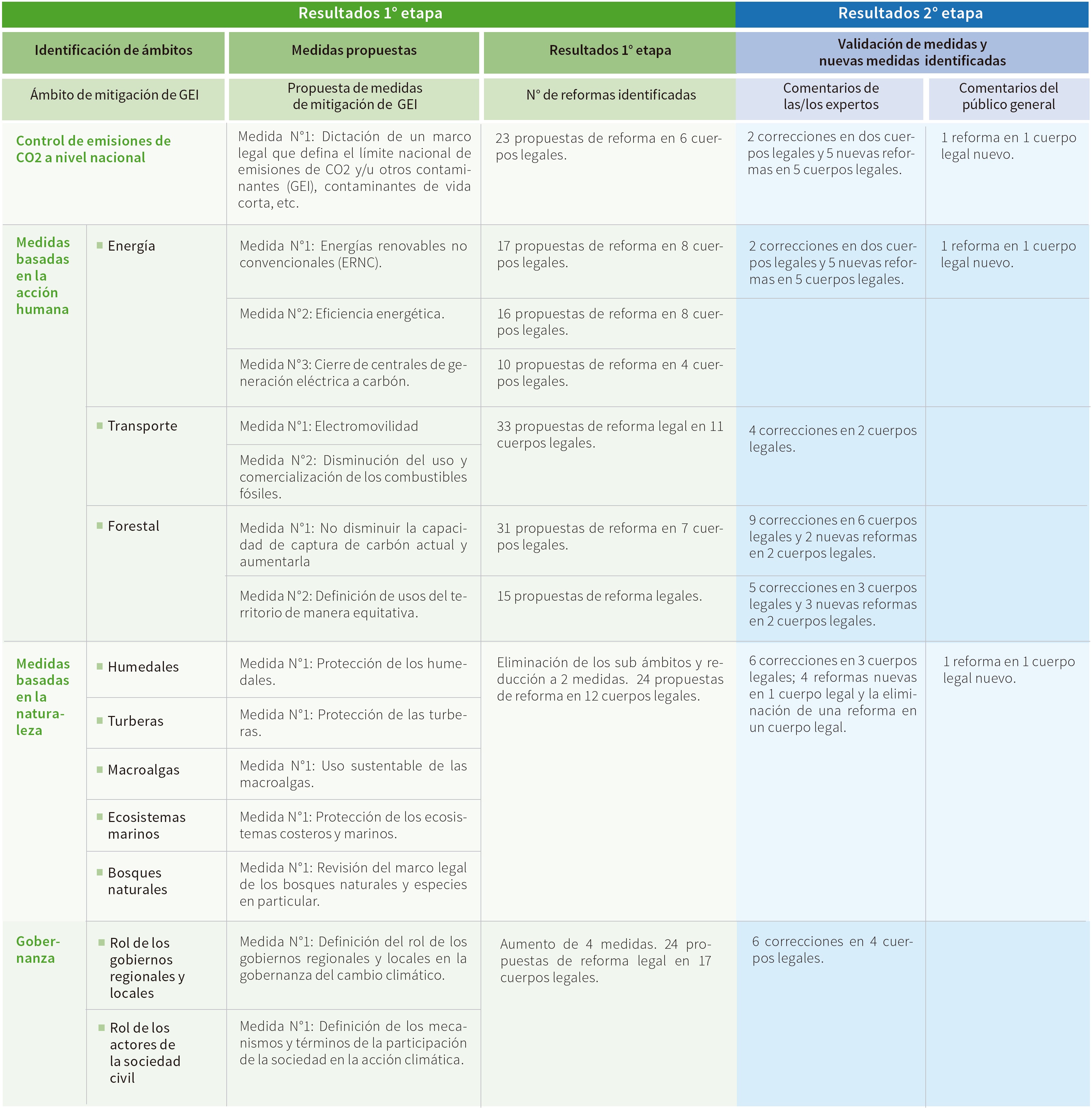 En la realización de este informe hallamos: (1) cuatro ámbitos de reformas legales de mitigación relevantes para alcanzar la carbono neutralidad para el año 2050; (2) la identificación de distintos cuerpos legales de diversa jerarquía normativa, como normas constitucionales, legales y administrativas; (3) la agrupación de medidas de mitigación en tipologías regulatorias, como prohibiciones, incentivos o normativas; y (4) áreas que generan debate entre expertos/as, y entre expertos/as y el público general.