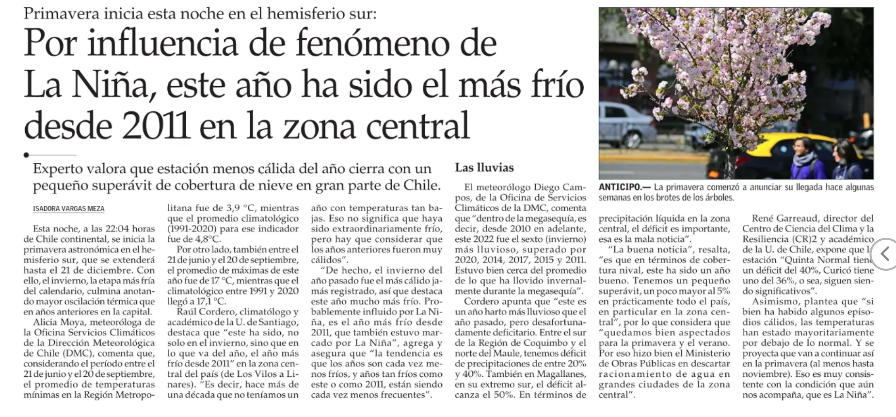 Esta noche, a las 22:04 horas de Chile continental, se inicia la primavera astronómica en el hemisferio sur, que se extenderá hasta el 21 de diciembre. Con ello, el invierno, la etapa más fría del calendario, culmina anotando mayor oscilación térmica que en años anteriores en la capital.