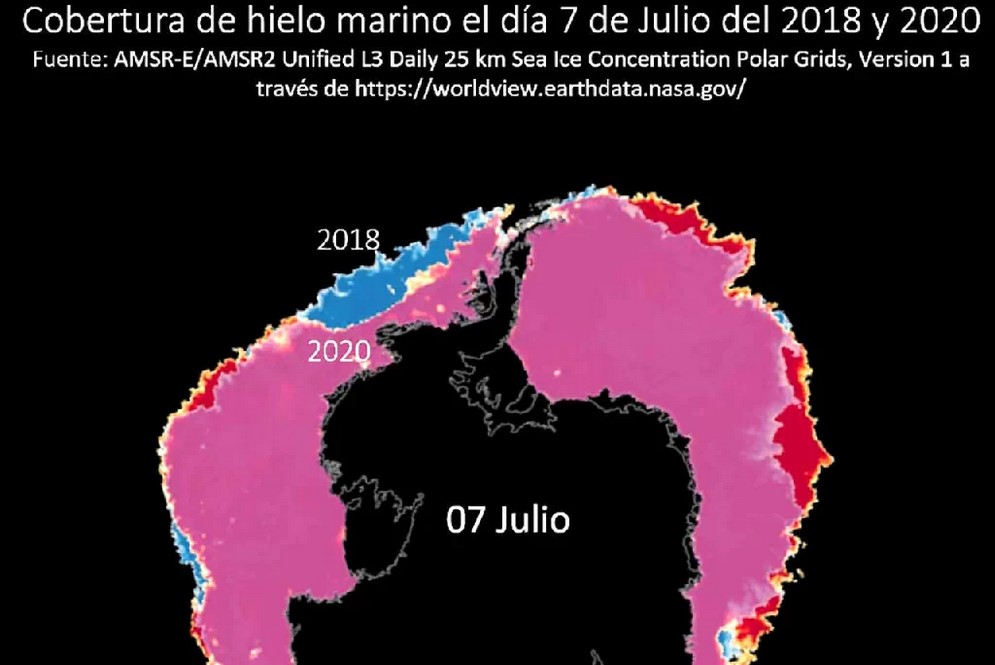 «La atmósfera es bien caótica», define René Garreaud, magíster en Geofísica y doctor en Meteorología. Luego muestra por Zoom una imagen titulada «Cobertura de hielo marino el día 7 de julio del 2018 y 2020», donde se ve una extensión de continente antártico que no está cubierta por hielo, a diferencia de todo el resto. Es la misma que acompaña estas líneas.