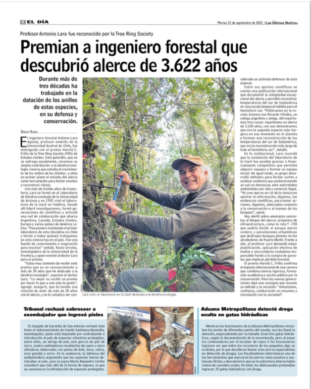 Premian a ingeniero forestal que descubrió alerce de 3.622 años (LUN) 23 de septiembre de 2025 120 Leer esta nota en LUN