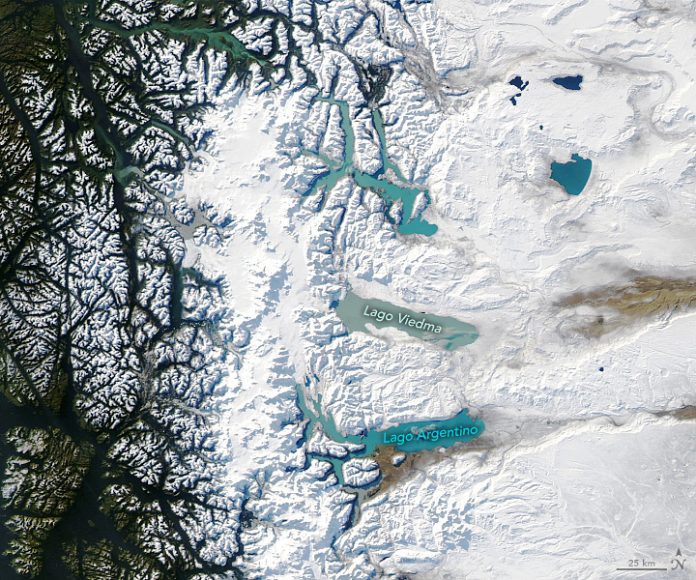 Pese a las bajas temperaturas, los lagos ubicados al este del Campo de Hielo Sur no alcanzaron a congelarse. “Cuando no se congelan, la ‘harina glacial’ que cae sobre ellos resalta el color turquesa de sus aguas sobre la blanca nieve circundante”, destacó el académico.