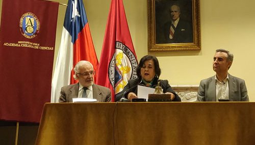 La presidenta de la Academia Chilena de Ciencias, Doctora Cecilia Hidalgo, encabezó la ceremonia y dio paso a la presentación de la trayectoria del profesor Garreaud que estuvo a cargo del académico de nuestro Departamento José Rutllant, miembro de número de la Academia Chilena de Ciencias.