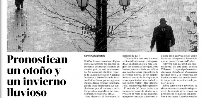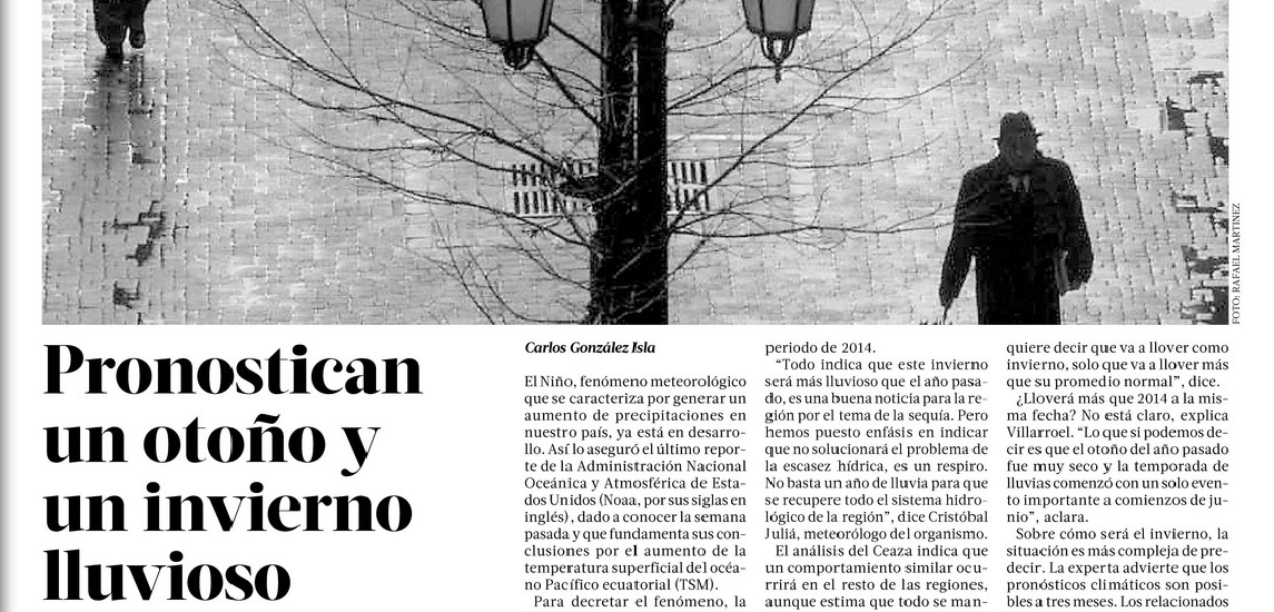 “Todo indica que este invierno será más lluvioso que el año pasado, es una buena noticia para la región por el tema de la sequía. Pero hemos puesto enfásis en indicar que no solucionará el problema de la escasez hídrica, es un respiro. No basta un año de lluvia para que se recupere todo el sistema hidrológico de la región”, dice Cristóbal Juliá, meteorólogo del organismo.
