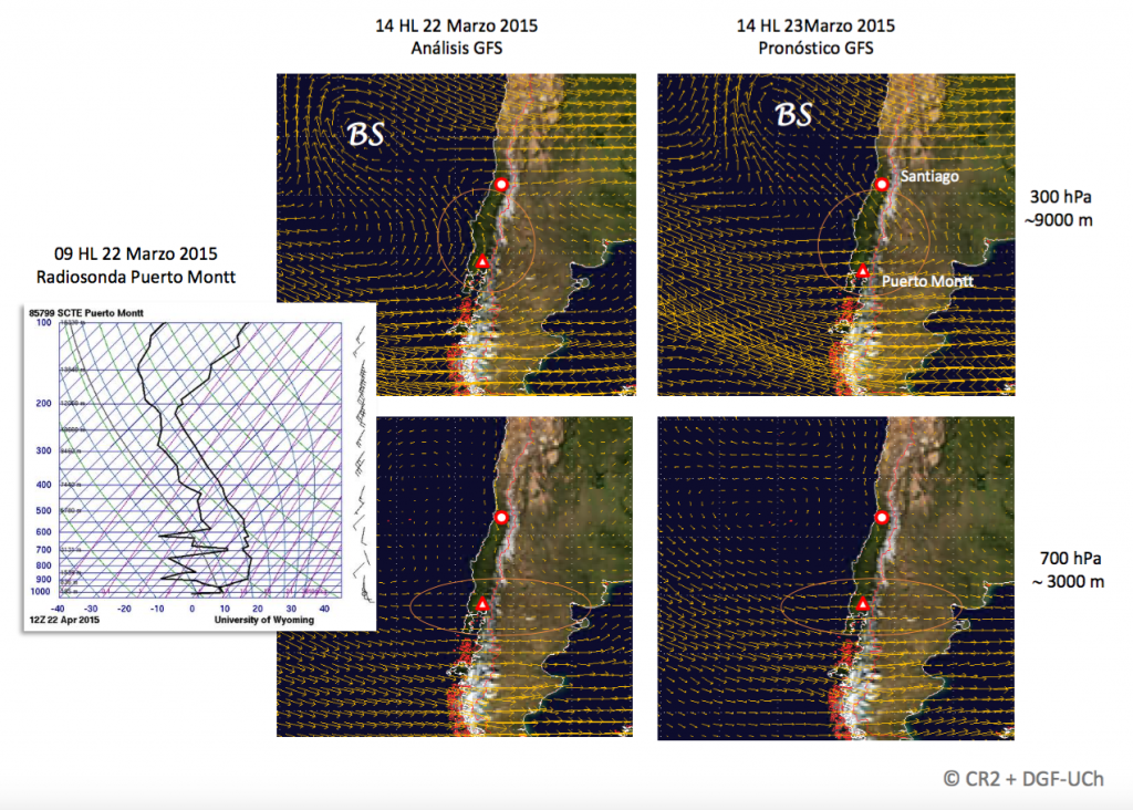 (Análisis de René Garreaud, 23 de abril) Aunque no es posible predecir el desarrollo de una erupción volcánica, lo que sí podemos es proyectar la dirección de la pluma del Volcán Calbuco en las próximas 24 a 36 horas, considerando los pronósticos meteorológicos y lo que ya se ha inyectado en la atmósfera.