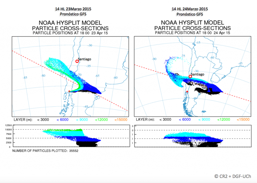 En la figura 2 se muestran los resultados del modelo de dispersión HYSPLIT de partículas forzado por los vientos del modelo meteorológico GFS. Asume una columna eruptiva de 10 km de altura y una erupción contínua de 12 horas.
