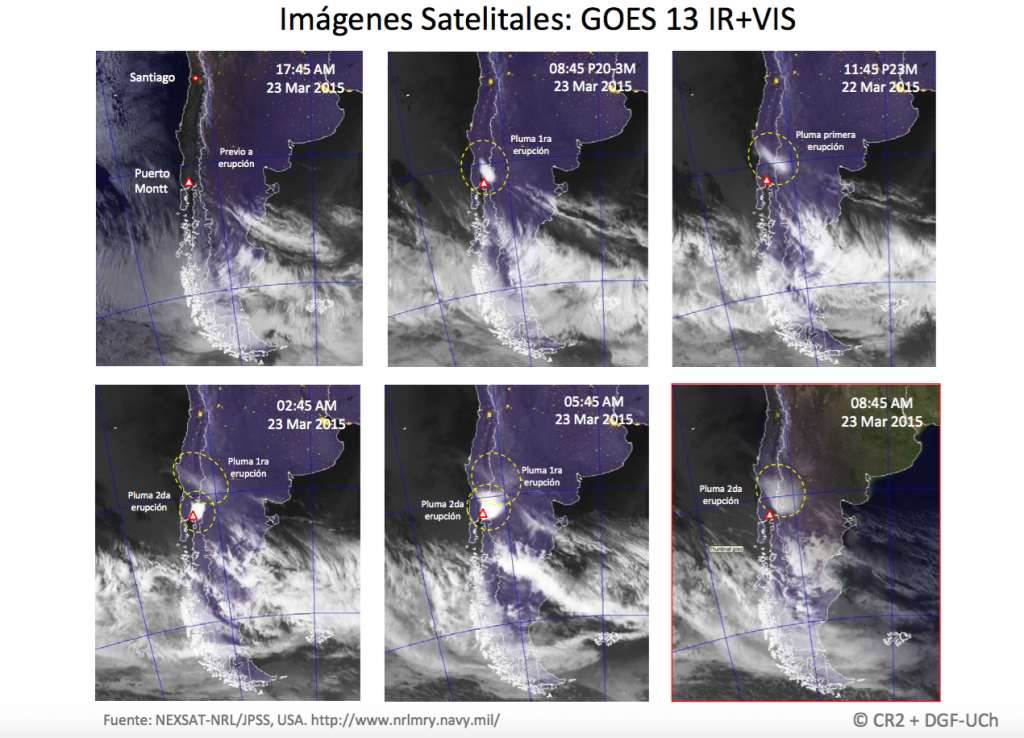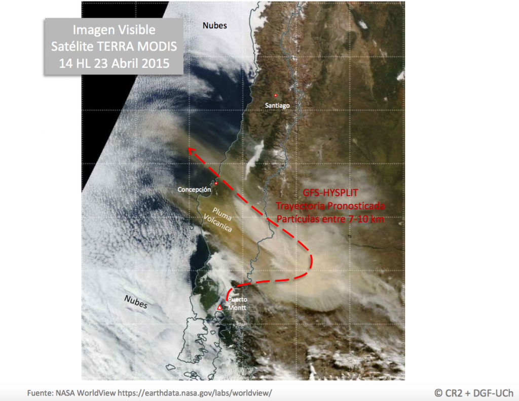 Por último, en la figura 3 se observan las imágenes satelitales que muestran el avance de la pluma del volcán Calbuco hacia el norte.