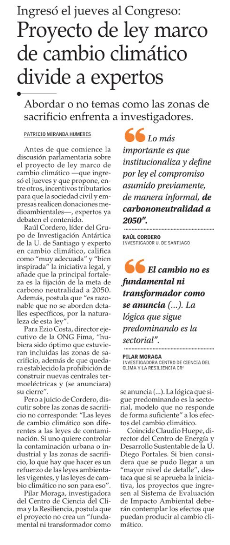 Proyecto de ley marco de cambio climático divide a expertos (El Mercurio)