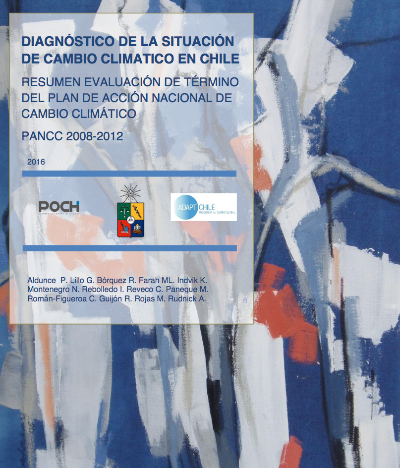 Publicación basada en: Aldunce P. Bello F. Bórquez R. Farah ML. Echeverría I. Indvik K. Lillo G. Montenegro N. Orell MI. Paneque M. Rebolledo I. Reveco C. Román-Figueroa C. Sepulveda E. Fuster R. Adler C. Costa L. Guijón R. Howden M. Keenan R. Neri C. Rojas M. Rudnick A. 2014. Evaluación de término del Plan de Acción Nacional de Cambio Climático, PANCC 2008-2012, Licitación N° 608897-101-LE14 del Ministerio del Medio Ambiente. 240p.