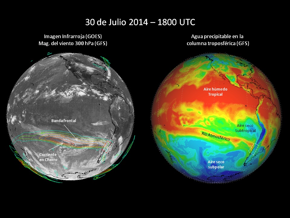 En la figura adjunta, el panel de la izquierda muestra precisamente la imagen satelital registrada el 30 de julio a las 14:00 hrs. por satélites geoestacionarios. Superpuesto a esta imagen hay algunas isotacas (líneas de igual magnitud del viento, obtenidas del modelo GFS) indicando la posición de una corriente en chorro en altura (cerca de los 10 km) con vientos del Oeste sobre los 200 km/h. Este chorro en altura acusa a su vez un fuerte contraste térmico en toda la troposfera al sur y norte de su eje.