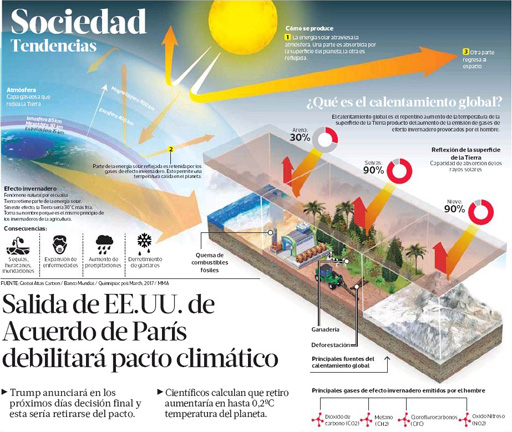 Adam Reed, especialista en políticas de cambio climático de la U. de Colorado, dice que retirarse debilitará el acuerdo, pues el liderazgo estadounidense junto al de China -los mayores emisores de gases de efecto invernadero (GEI)- fue crucial. “Es lamentable, ya que los compromisos ofrecidos en el Acuerdo de París eran sólo un punto de partida, y por sí mismos eran insuficientes para limitar el calentamiento a la meta de 2 ºC”, dice.