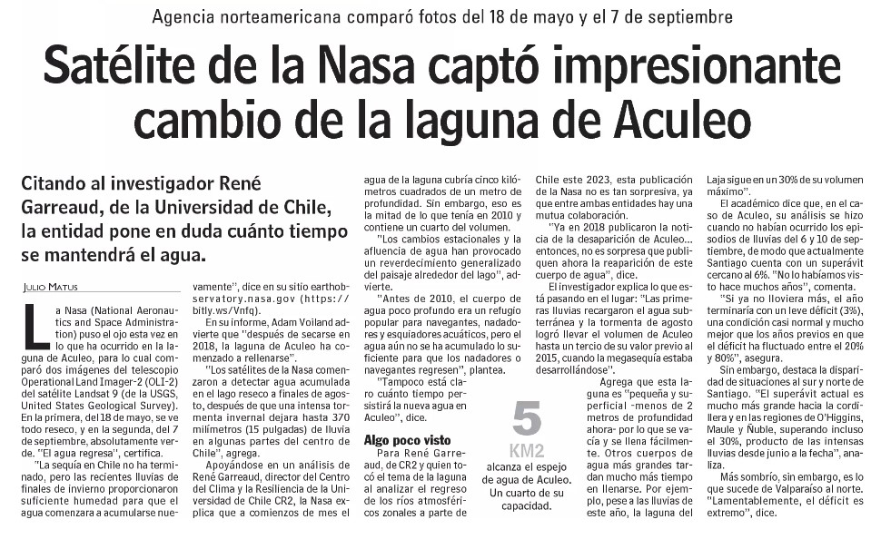 Citando al investigador René Garreaud, de la Universidad de Chile, la entidad pone en duda cuánto tiempo se mantendrá el agua.