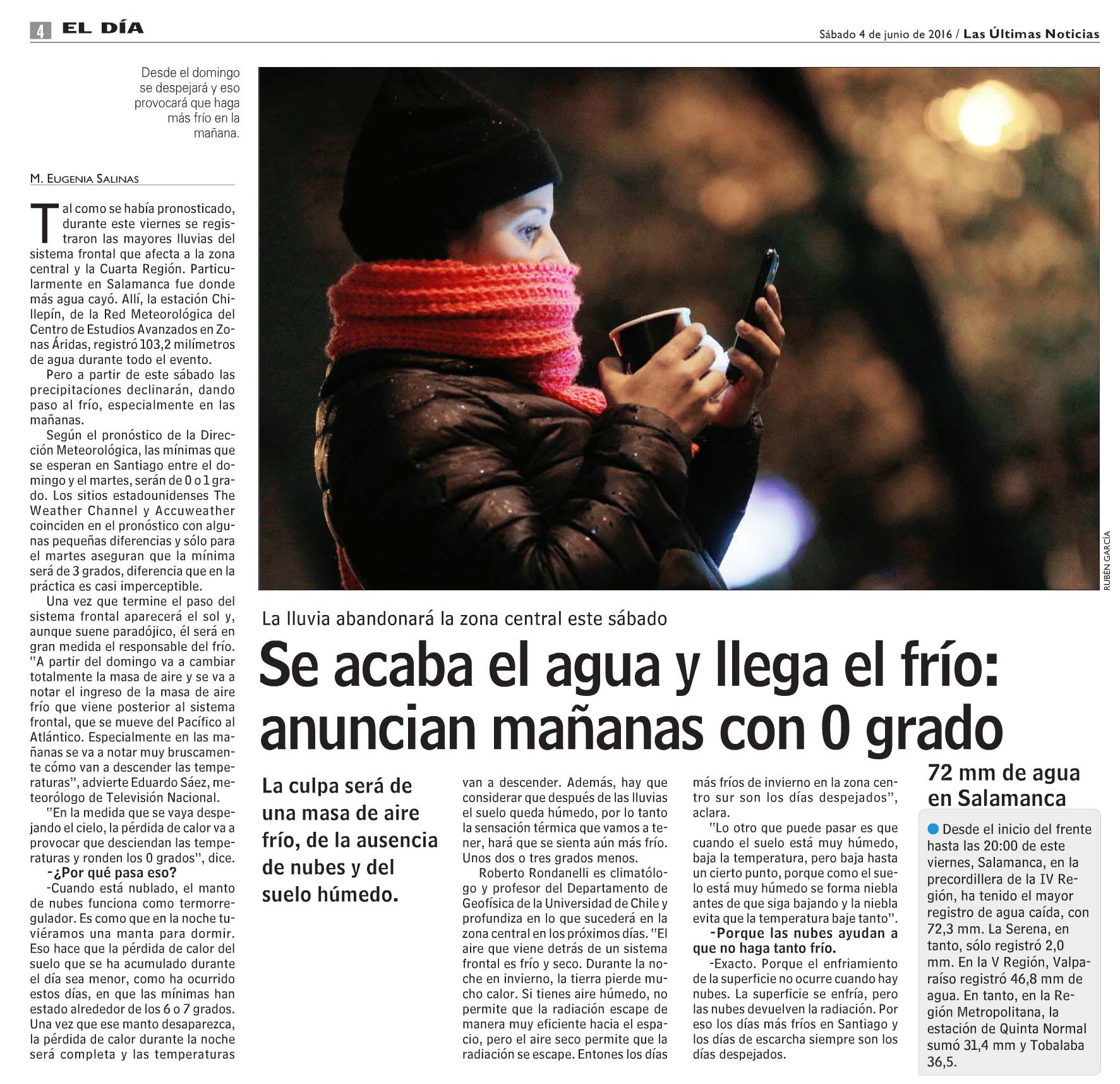 Zona costera Se acaba el agua y llega el frío: anuncia mañanas con 0 grado (Las Últimas Noticias) 4 de junio de 2016 2176 Leer nota en Las Últimas Noticias