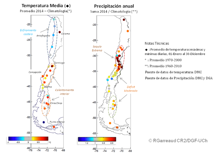 Continua el marcado calentamiento de los valles interiores y la precordillera en la zona centro-norte de Chile, en especial en los registros de temperatura máxima. La temperatura media durante el 2014 fue entre 0.5 y 1°C superior al promedio histórico (1970-2000) en la mayoría de las estaciones de esta zona. No obstante, este año no se alcanzaron valores extremos y el 2014 fue levemente más frío que el 2013.