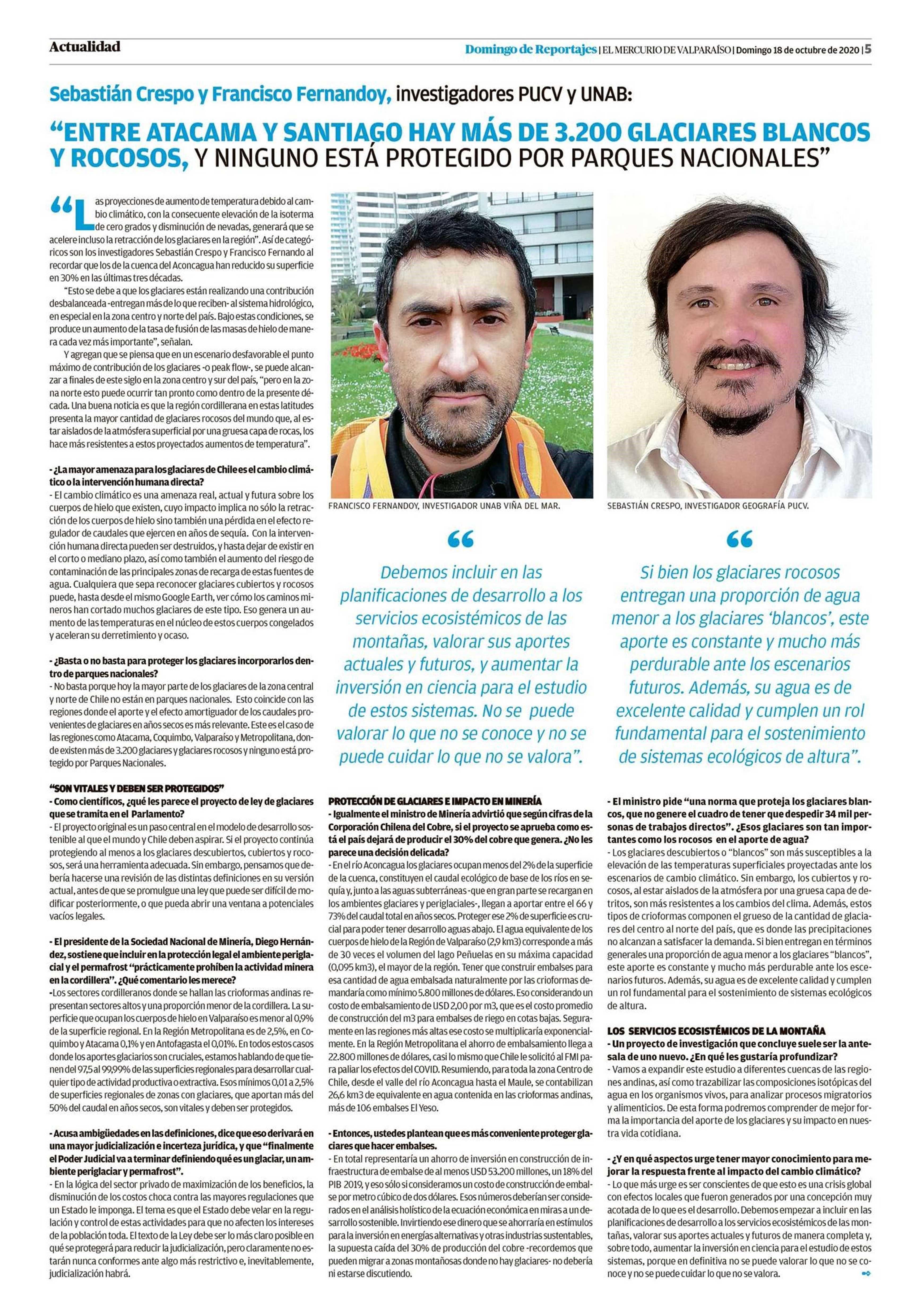 Sebastián Crespo y Francisco Fernandoy, investigadores PUCV y UNAB: «Entre Atacama y Santiago hay más más de 3200 glaciares blancos y rocosos, y ninguno está protegido por parques nacionales» (El Mercurio de Valparaíso)