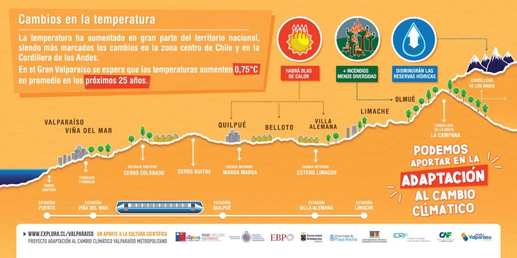 En un trabajo en conjunto con distintas instituciones y centros de investigación del país, se desarrollaron ocho gigantografías que entregan información sobre los procesos que se están viendo afectados por el cambio climático y los aportes que podemos hacer para adaptarnos a éste. Las imágenes estarán disponibles en todas las estaciones del Metro de Valparaíso.