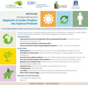 Uno de los mensajes claves generados del reciente liberado Quinto Reporte del Grupo de Trabajo II del IPCC es el déficit existente de implementación de medidas de adaptación respecto a la necesidad actual de la sociedad de adaptarse. Para hacernos cargo de esta problemática hemos convocado a expertos internacionales como nacionales para compartir experiencias de investigaciones en adaptación al cambio climático, con énfasis en cómo se traduce la normativa y resultados de investigación en acción. La discusión se centrará en las barreras que se presentan para que esto suceda y casos exitosos de adaptación con énfasis a nivel local, que es dónde se materializan las acciones de adaptación, y como estas acciones a nivel local se articulan con distintos niveles de gobernanza. Como producto del seminario se espera obtener un resumen de barreras y propuestas de acciones identificadas durante discusión para promover la implementación de prácticas de adaptación.