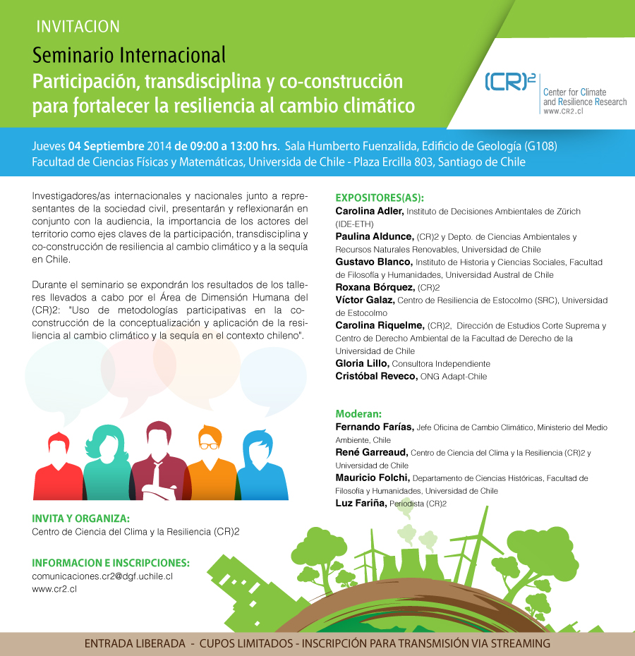 “Investigadores/as internacionales y nacionales junto a representantes de la sociedad civil, presentarán y reflexionarán en conjunto, la importancia de los actores del territorio como ejes claves de la participación, transdisciplina y co-construcción de resiliencia al cambio climático y a la sequía en Chile. Durante el seminario se expondrán los resultados de los talleres llevados a cabo por el Área de Dimensión Humana del (CR)2: «Uso de metodologías participativas en la co-construcción de la conceptualización y aplicación de la resiliencia al cambio climático y la sequía en el contexto chileno».