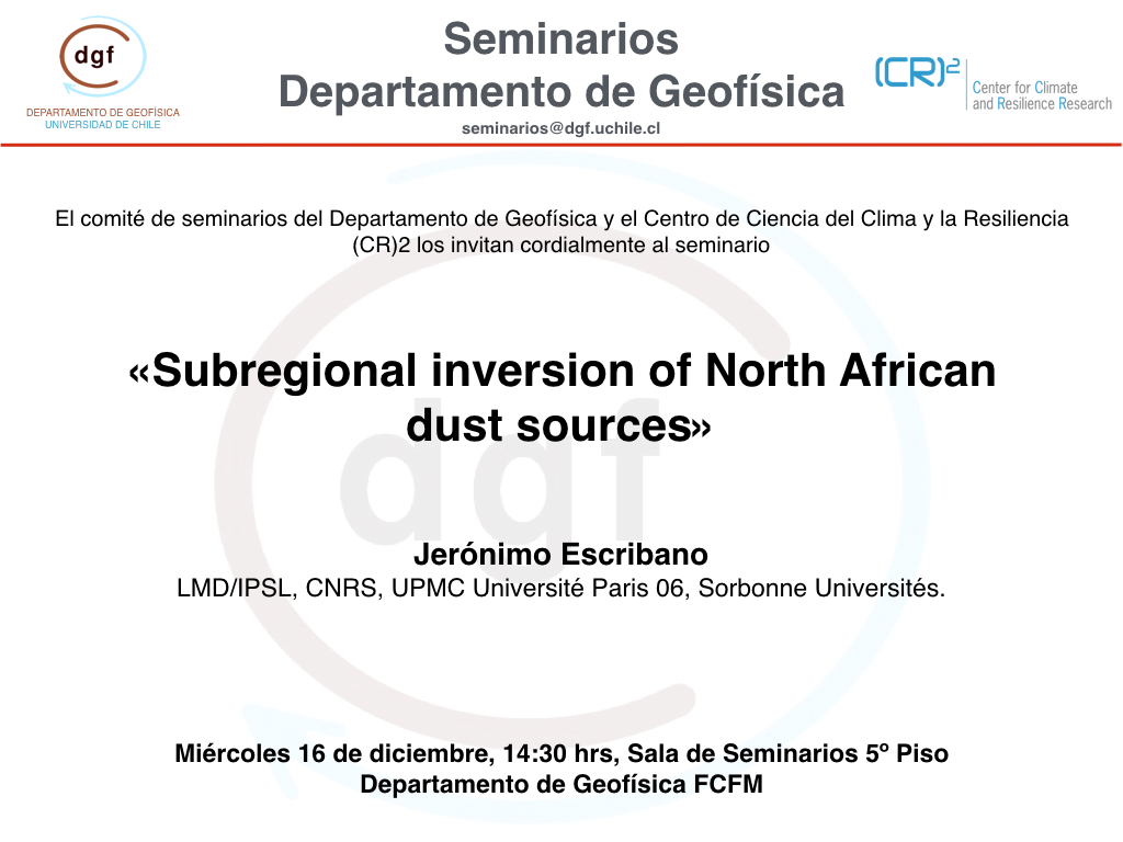 El Comité de Seminarios del Departamento de Geofísica FCFM y el Centro de Ciencia del Clima y la Resiliencia (CR)2 invitan al seminario «Subregional inversion of North African dust sources», dictado por Jerónimo Escribano del LMD/IPSL, CNRS, UPMC Université Paris 06, Sorbonne Universités.