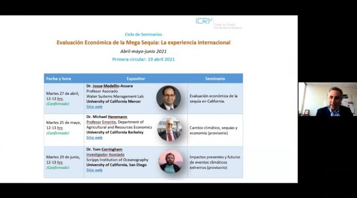 El ciclo tuvo inicio con la charla «El costo de la Megasequía: La experiencia internacional de California», realizada por el Dr. Josué Medellín-Azuara, profesor asociado del Water Systems Management Lab, de la University of California Merced, Estados Unidos.