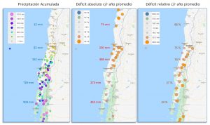 Figura 1: Condición pluviométrica en Chile central al 15 de octubre de 2019. Datos obtenidos desde la Dirección Meteorológica de Chile (DMC), la Dirección General de Aguas (DGA) y AgroMet. Los paneles de izquierda a derecha corresponden a la precipitación acumulada desde el 1 de enero, la diferencia de esa acumulación con respecto a un año normal y la diferencia anterior dividida por el valor promedio. Los números de norte a sur corresponden a los valores en La Serena, Santiago, Curicó, Temuco y Puerto Montt (datos DMC).