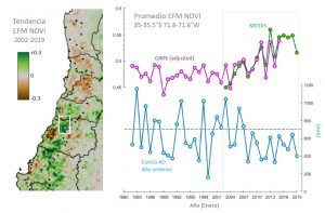 Para ilustrar mejor la evolución de la vegetación vista desde el satélite, la Figura 2 (panel B) incluye la serie de tiempo del NDVI de verano en una caja ubicada al oeste de la localidad de Teno, en el límite norte de la región del Maule. Antes del año 2000, el NDVI de esta zona era levemente modulado por la precipitación del año anterior, pero desde comienzos de este siglo presenta una clara tendencia de aumento, lo que, paradójicamente, coincide con la megasequía.