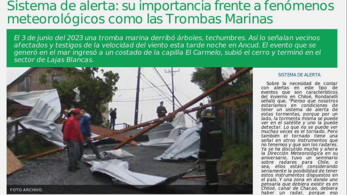 Sobre la necesidad de contar con alertas en este tipo de eventos que son característicos del invierno en Chiloé, Rondanelli señaló que, “Pienso que nosotros estaríamos en condiciones de tener un sistema de alerta de estas tormentas, porque por un lado, la tormenta misma se puede ver en el satélite y uno la puede detectar. Lo que no se puede ver muchas veces es el tornado. Pero también el tornado tiene una señal en otros instrumentos que no tenemos y que son los radares. Ya se ha discutido mucho y ahora la Dirección Meteorológica en su aniversario, tuvo un seminario sobre radares para Chile, o sea, ellos están considerando seriamente la posibilidad de tener estos instrumentos dispuestos en el país. Y una zona en donde uno pensaría que debiera existir es en Chiloé, canal de Chacao, debiera haber un radar, porque eso permitiría dar alguna alerta. No es una alerta con mucho tiempo de anticipación, son unos minutos, pero sí evitaría, por ejemplo, que la gente quedara expuesta en la calle, por ejemplo, a un tornado”.