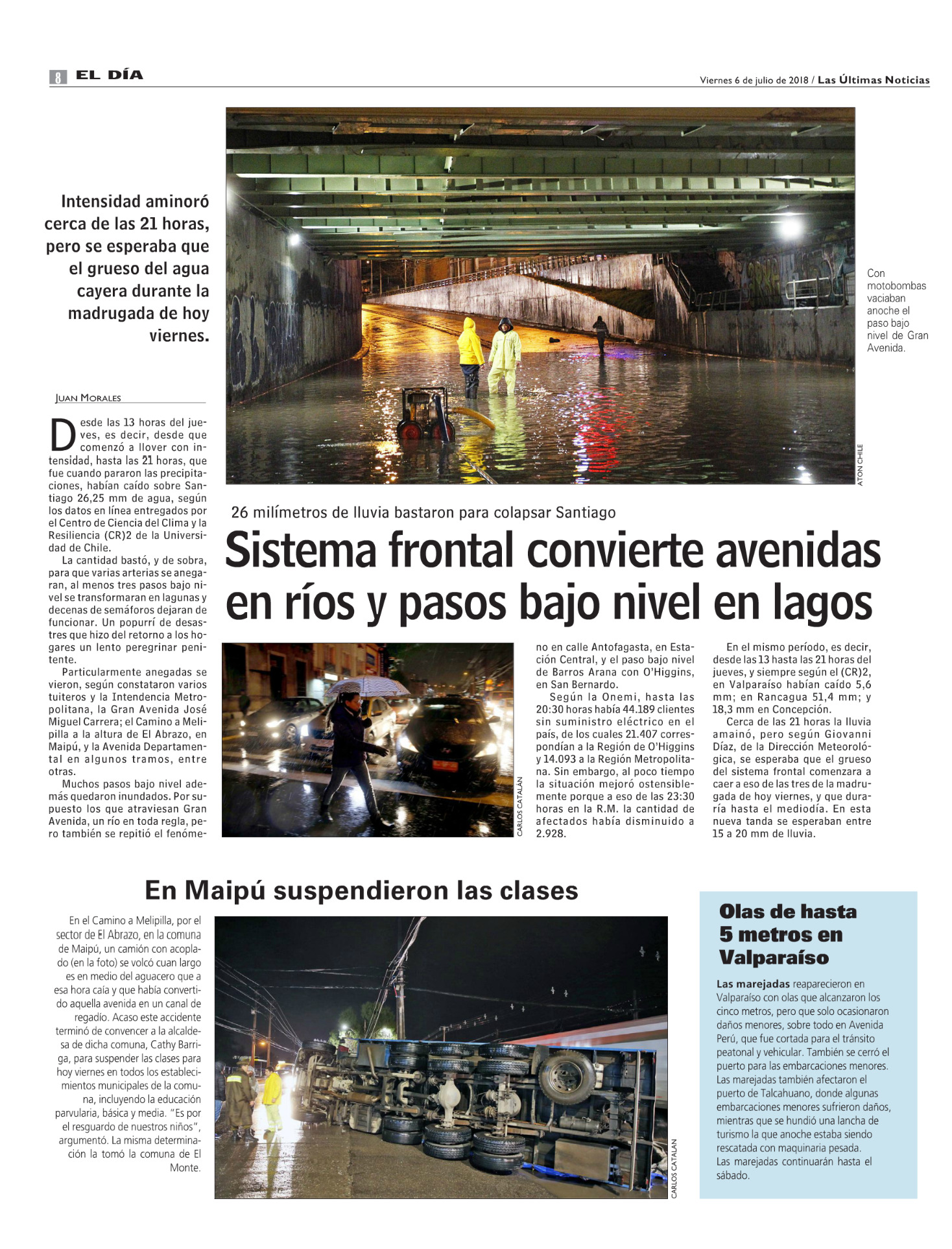 Desde las 13 horas del jueves, es decir, desde que comenzó a llover con intensidad, hasta las 21 horas, que fue cuando pararon las precipitaciones, habían caído sobre Santiago 26,25 mm de agua, según los datos en línea entregador por el Centro de Ciencia del Clima y la Resiliencia (CR)2 de la Universidad de Chile.
