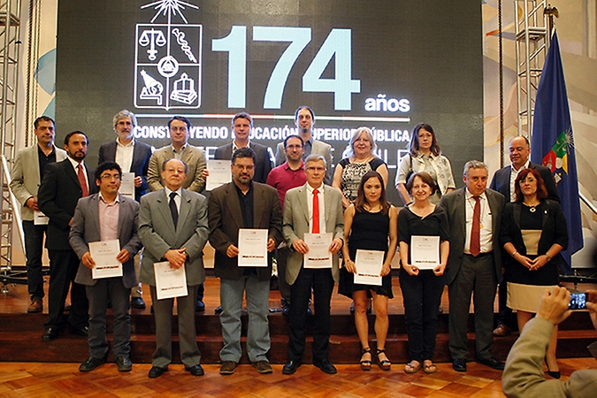 Por primera vez en el marco de la conmemoración del aniversario de la Universidad de Chile, nuestra Casa de Estudios brindó una especial ceremonia de reconocimiento a 184 de sus académicos por la realización de trabajos de alto impacto social en investigación, innovación y creación artística durante el último año. El evento, desarrollado este martes 15 de noviembre en el Salón de Honor de Casa Central, tuvo como objetivo relevar la labor de excelencia emprendida por el equipo docente, en las diversas áreas del conocimiento y del quehacer universitario, así como destacar el rol central ocupado por la institución en el desarrollo del país.