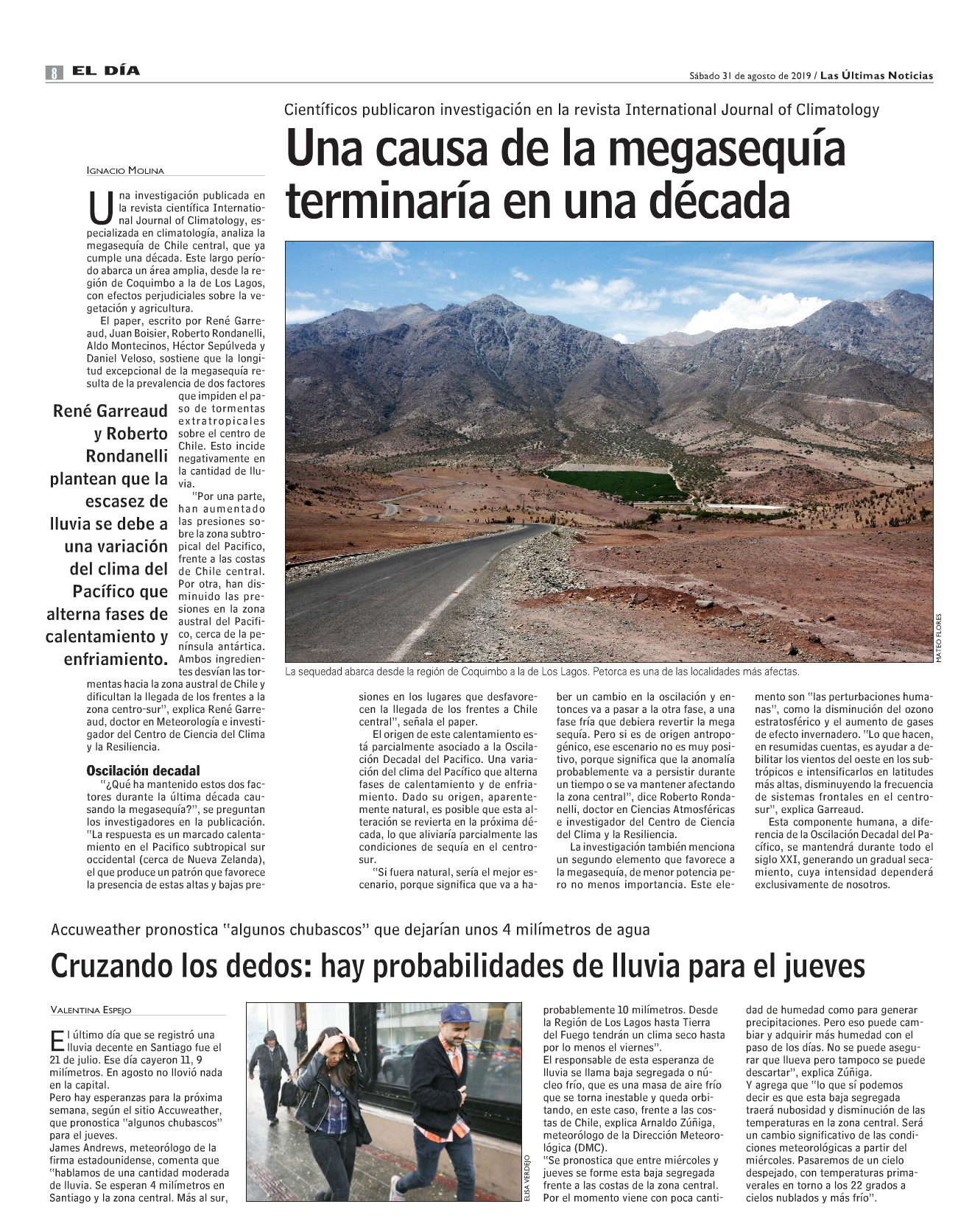 René Garreaud y Roberto Rondanelli plantean que la escasez de lluvia se debe a una variación del clima del Pacífico que alterna fases de calentamiento y enfriamiento.