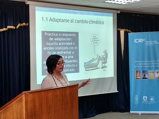 Antes de evaluar de manera grupal las prácticas locales de adaptación al cambio climático, los asistentes conocieron un poco más de los antecedentes científicos de este fenómeno global. Laura Gallardo, directora del (CR)2, se refirió a las proyecciones para la zona central de Chile recalcando que «se espera una disminución en las precipitaciones, pero un aumento en eventos cálidos de precipitación pues la isoterma cero estará a cada vez a mayor altura».