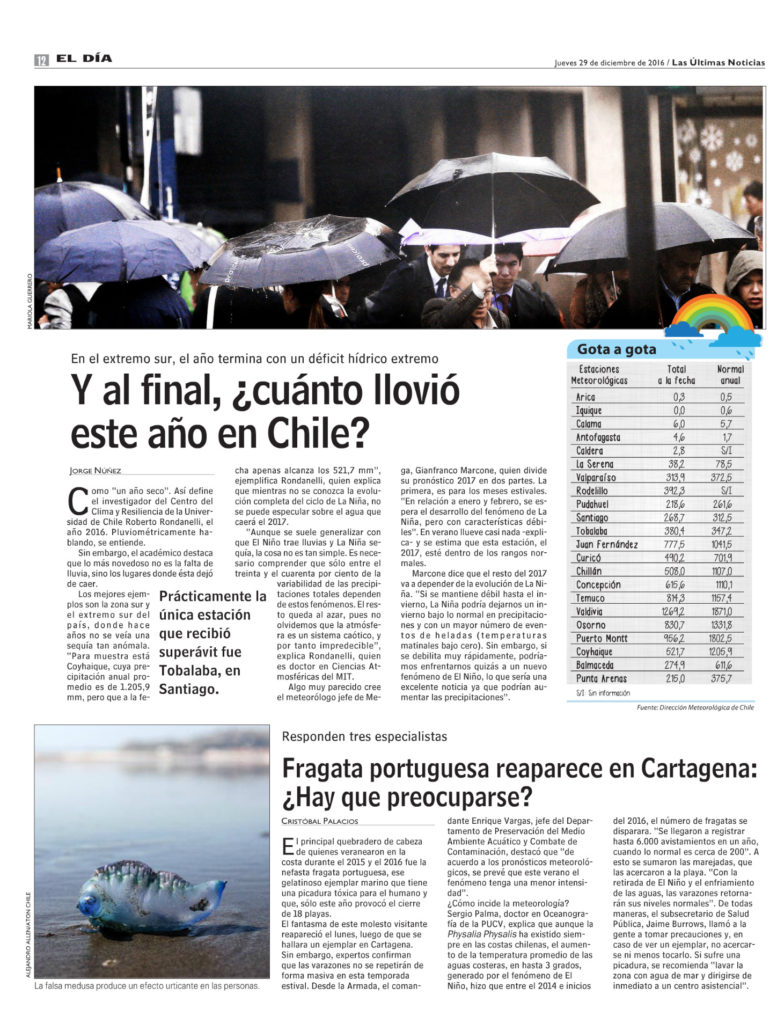 Como «un año seco». Así define el investigador del Centro del Clima y Resiliencia de la Universidad de Chile, Roberto Rondanelli, el año 2016. Pluviométricamente hablando, se entiende.